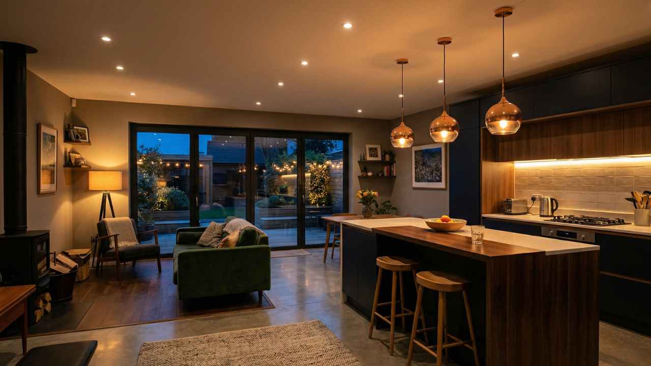 For extensions with large glazed areas or bi-fold doors, plan for what happens after dark. During the day, natural light does the heavy lifting. But at night, all that glass becomes a black mirror unless you've got a proper lighting scheme to compensate. Recessed downlights, pendant fixtures, and well-planned electrical layouts need to be decided at the design stage, not as an afterthought.